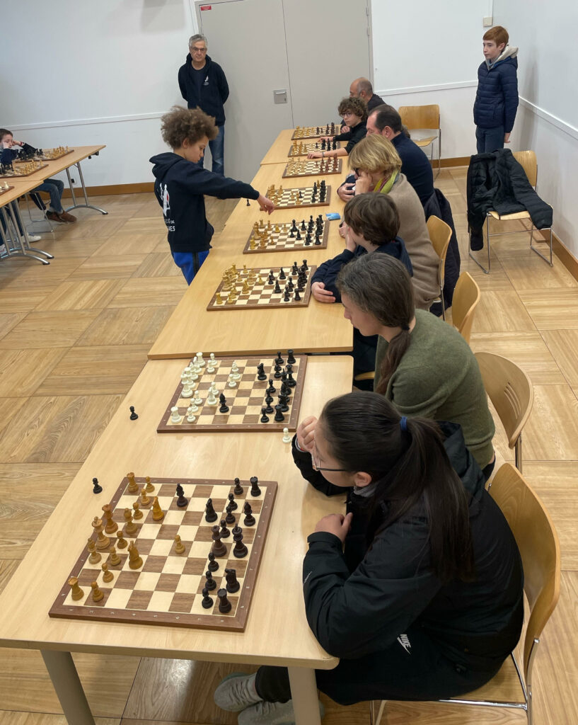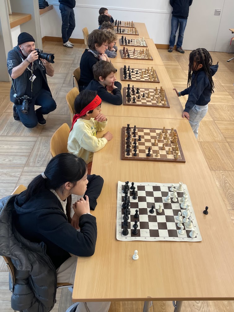 Le matin, en ce jour de célébration, une simultanée a été organisée, mettant en scène Isis (9 ans cette année), face à 8 compétiteurs et compétititres débutants. Isis jouait les blancs contre tous les adversaires et se présentait devant chaque échiquier l’un après l’autre pour placer un coup en réponse au mouvement de l’adversaire. Isis a su s’imposer avec brio en remportant les 8 parties !
